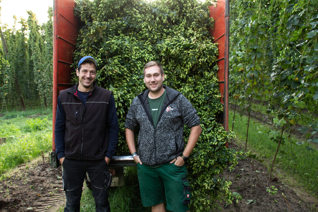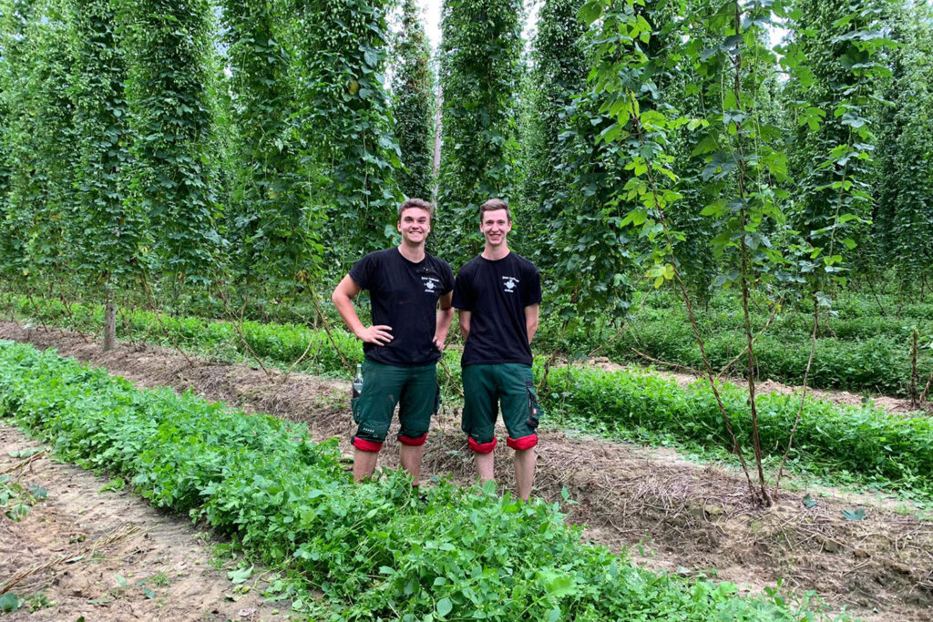 Junior Chef Fredi Oberlindober (rechts) mit unserem Hopfen-Vertragsbauern Joahnn Kuffner in dessen Hopfengarten in der Hallertau.
