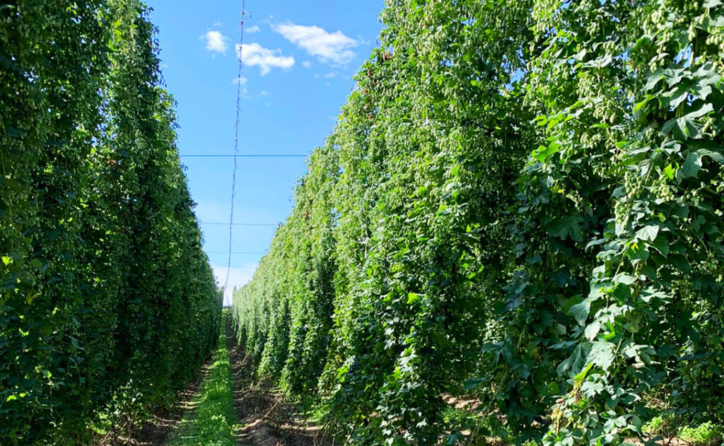 Der Hopfen wird jedes Jahr im Frühjahr (ab Ende März) gesetzt. Bis zur Ernte wächst das sehr schnell wachsende Hanfgewächs in den Hopfengärten entlang von Drähten, die als Rankhilfe dienen bis auf 7 Meter Höhe. Die Hopfenernte beginnt je nach Witterung meist Ende August. Dann werden die Hopfenreben samt Draht geerntet. Dabei fährt ein Traktor mit einem speziellen Pflückgerät an den Reben entlang, die dann auf dem Anhänger hinter dem Traktor landen und anschließend zum Hof gebracht werden. Dort werden die Dolden maschinell von der Pflanze gepflückt. Die Verarbeitung des Hopfens beim Bauern ist damit jedoch noch lange nicht abgeschlossen.