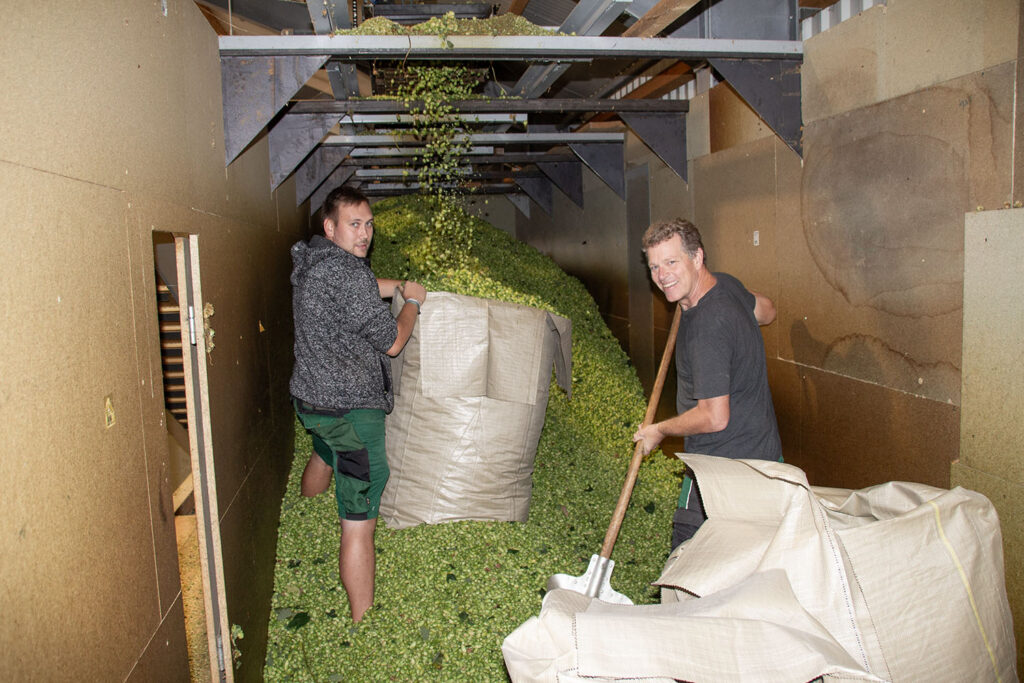 Fredi und Eric verpacken den frisch geernteten und unverarbeiteten Grünhopfen in Säcke.