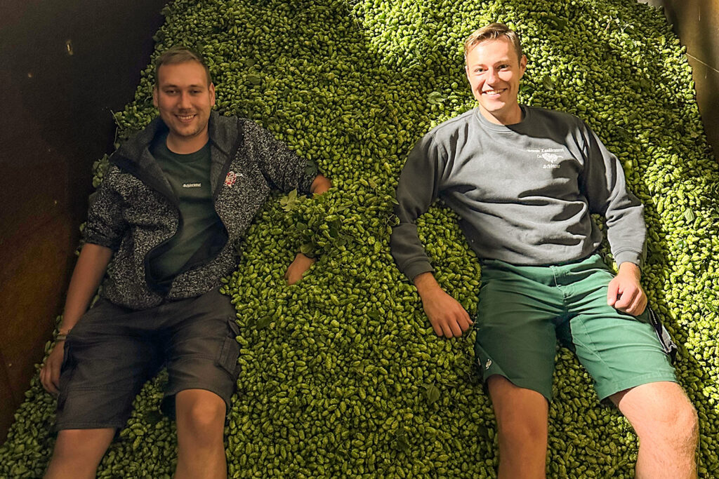 Bei unseren befreundeten Hopfenbauern dürfen jedes Jahr unsere Auszubildenden bei der Hopfenernte mithfelfen. Dadurch können die angehenden Brauer und Brauerinnen einiges über den Hopfen lernen und sehen auch, wie anstrengend die Arbeit im Hopfengarten sein kann.