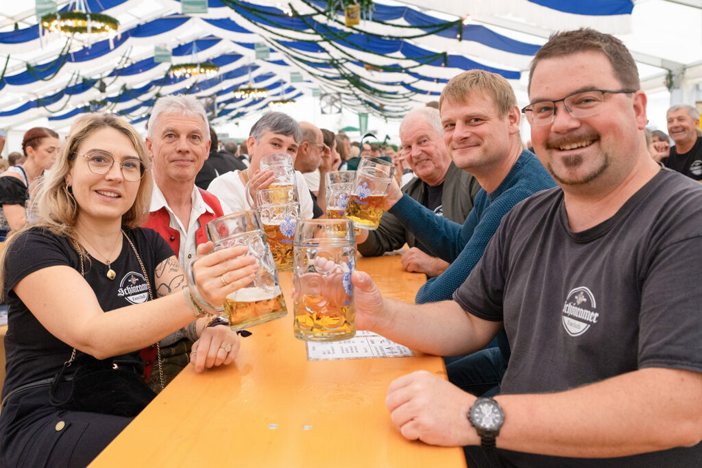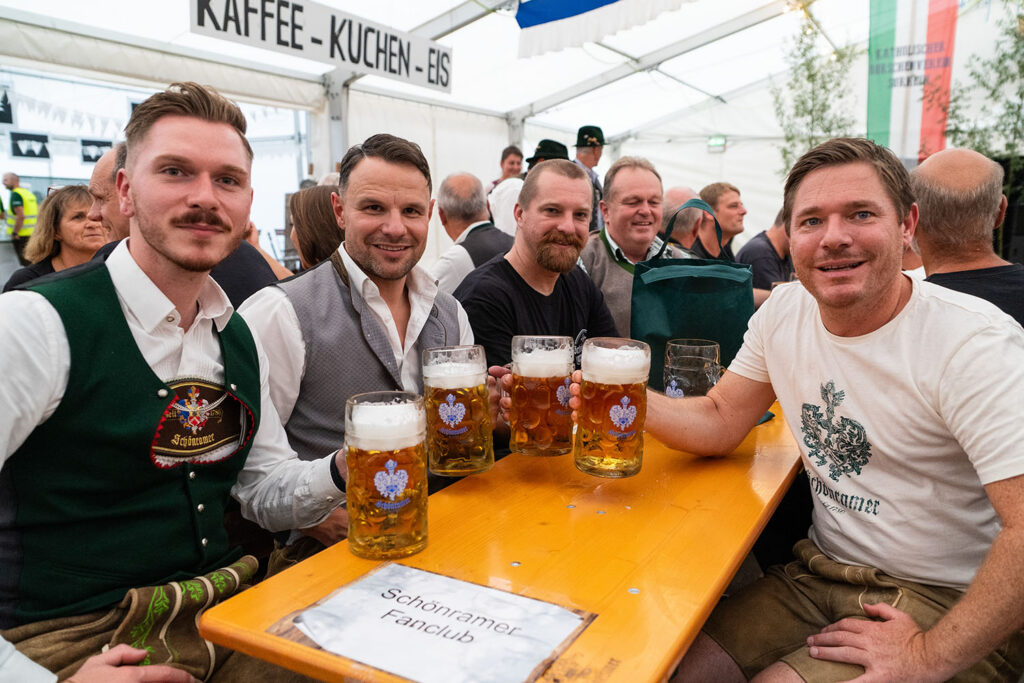Auch der monatlich stattfindende Fanclub-Stammtisch der Brauerei Schönram war beim Bieranstich mit dabei. Rund 45 Mitglieder aus Nah und Fern – von insgesamt stolzen 3.300 – nahmen am Festauftakt teil und durften sich über eine Maß Freibier freuen.